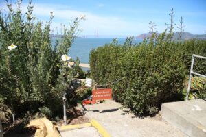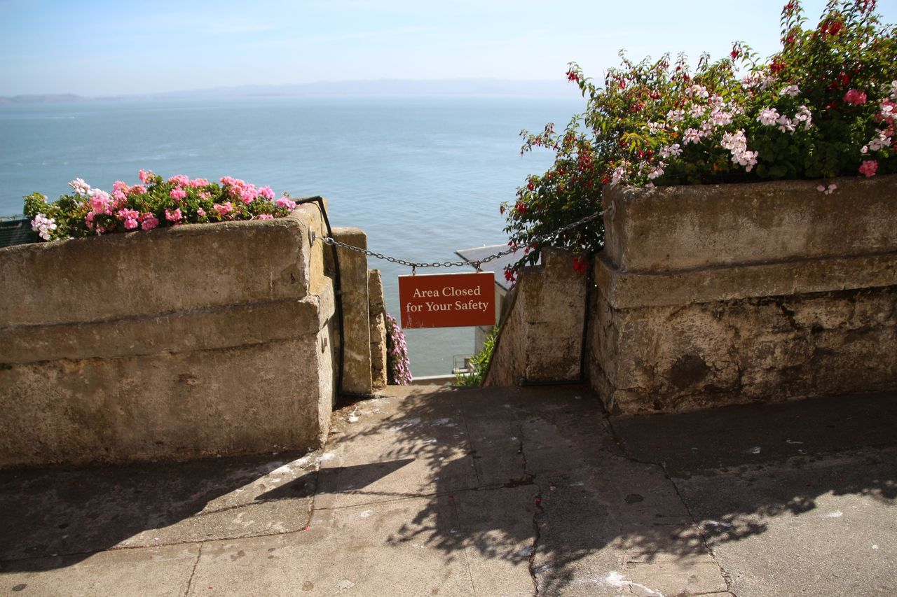 Pendant la visite, nous alternons la visite de bâtiments et les promenades à l’extérieur. Les visiteurs peuvent déambuler relativement librement sur Alcatraz. Je dis bien « relativement » car au final il y a beaucoup de panneaux qui interdisent d’emprunter tel ou tel chemin, d’entrer dans tel bâtiment, de monter tel escalier. Le site est délabré, et malgré les campagnes de restauration, beaucoup de zones sont considérées comme dangereuses. A force de voir ces panneaux un peu partout, on finit par en rigoler et à en collectionner les photos. C’est un peu comme être libre d’aller partout dans une maison, à condition de rester dans le couloir…