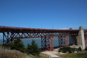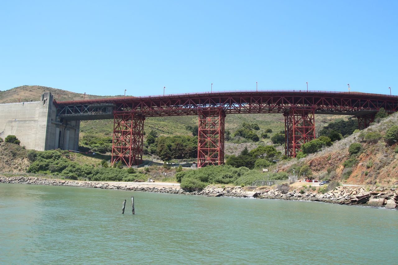 Et là une fois cette photo prise, nous allons descendre jusqu’au rivage en prenant une route qui passe sous le pont. D’ailleurs pour y accéder, il faut emprunter des escaliers puis un couloir qui est situé sous la chaussée. Le passage semblait en travaux, en tout cas c’était un peu galère avec nos vélos. Au moment où j’écris cet article, je me rends compte que nous aurions dû continuer un peu notre chemin pour prendre la photo du pont avec San Francisco derrière. Pour faire cette photo, il faut se rendre sur un point de vue un peu plus haut sur la colline à l’Ouest du point. Seulement sur le moment j’ai oublié qu’il y avait cet autre point de vue à visiter. C’est dommage car avec le temps dégagé que nous avions cela aurait été super. Tant pis !