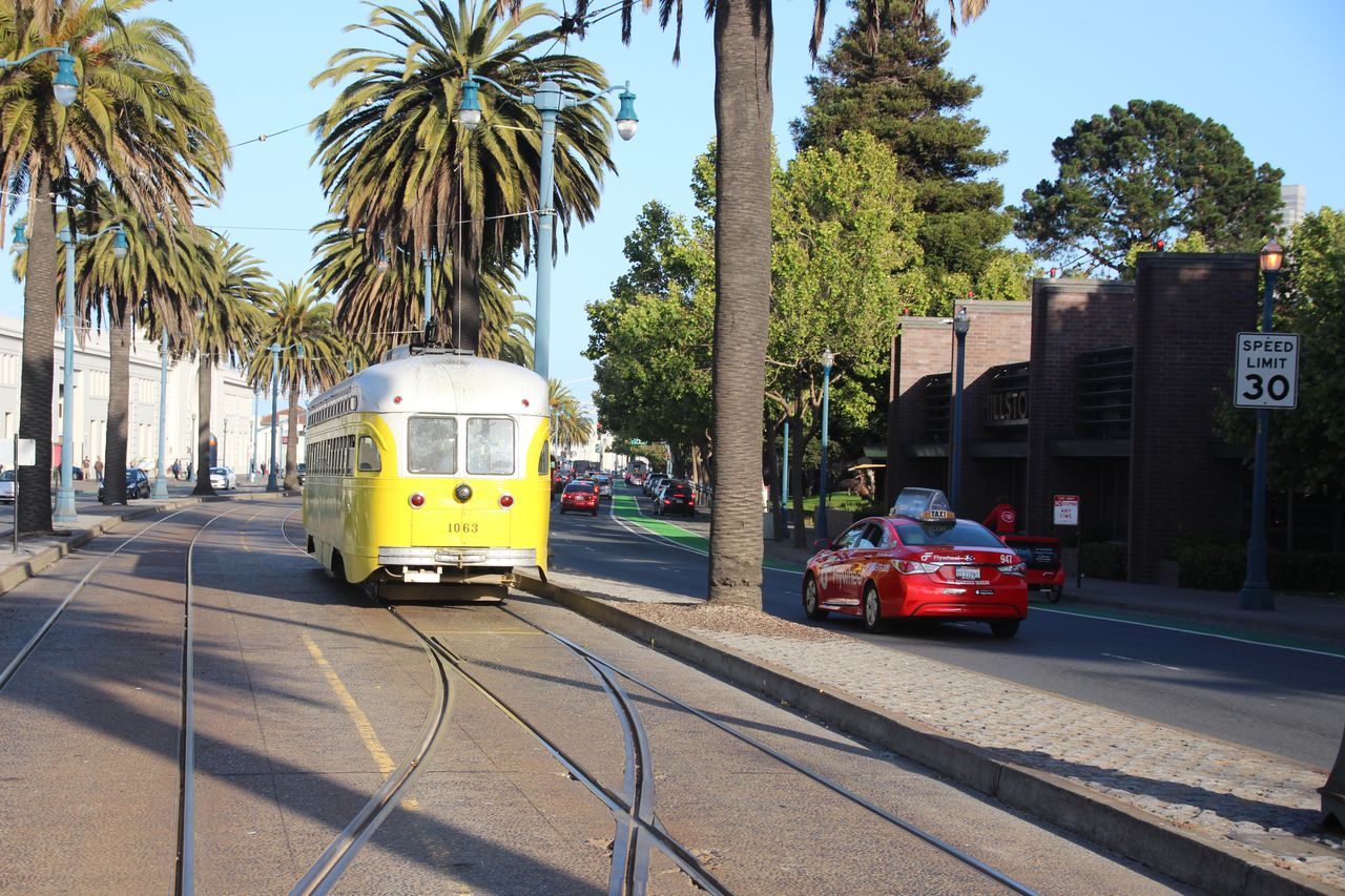 Nous marchons ensuite vers Market Street, l’artère principale de San Francisco. Nous y étions il y a 2 jours pour acheter nos titres de transports. Beaucoup de boutiques sont de part et d’autre de la rue et la plupart des lignes de bus y passent. Nous avons pour objectif de faire un tour en Street Car jusqu’à… Fisherman’s Wharf ! Nous attendons à l’arrêt et j’en profite pour faire des photos qui illustrent la page du 2 juin quand je détaille les transports en commun de la ville. C’est l’avantage d’écrire en décalé, je peux illustrer mes propos avec des photos des jours suivants ! Nous nous installons complètement à l’arrière du véhicule, ce qui me permet de faire des photos à travers les vitres latérales et la lunette arrière. Je peux ainsi faire des clichés des Street Cars que nous croisons et qui nous suivent.