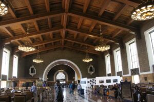 Vers midi et demi nous arrivons à Los Angeles après 3 heures de voyage sans accrocs. La gare où nous sommes est Union Station en plein milieu de Los Angeles. C’est une gare bien connue des cinéphiles car elle apparait dans un de mes films préférés : Blade Runner. Il s’agit dans le film du poste de police. Il fait très lumineux dehors, le temps est au beau fixe à Los Angeles, du coup pour la photo ce n’est pas facile.