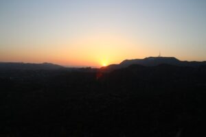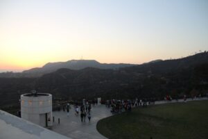 Les 2 heures sont écoulées, il est grand temps d’aller à l’observatoire Griffith pour profiter de la vue panoramique et du coucher de soleil. On y arrive assez rapidement. Et assez rapidement on se rend compte qu’on est pas les seuls a avoir eu l’idée. Une file indienne de voiture monte la colline et je loupe une place super grande, quasiment à l’entrée de l’observatoire alors que je n’ai personne derrière moi. Du coup on fait demi tour et on est obligé de se garer super loin. Comme le soleil est en train de descendre très vite, on marche à toute vitesse jusqu’à l’observatoire. Je sais pas à quelle allure on était mais au retour on mettra du temps à rejoindre la voiture.